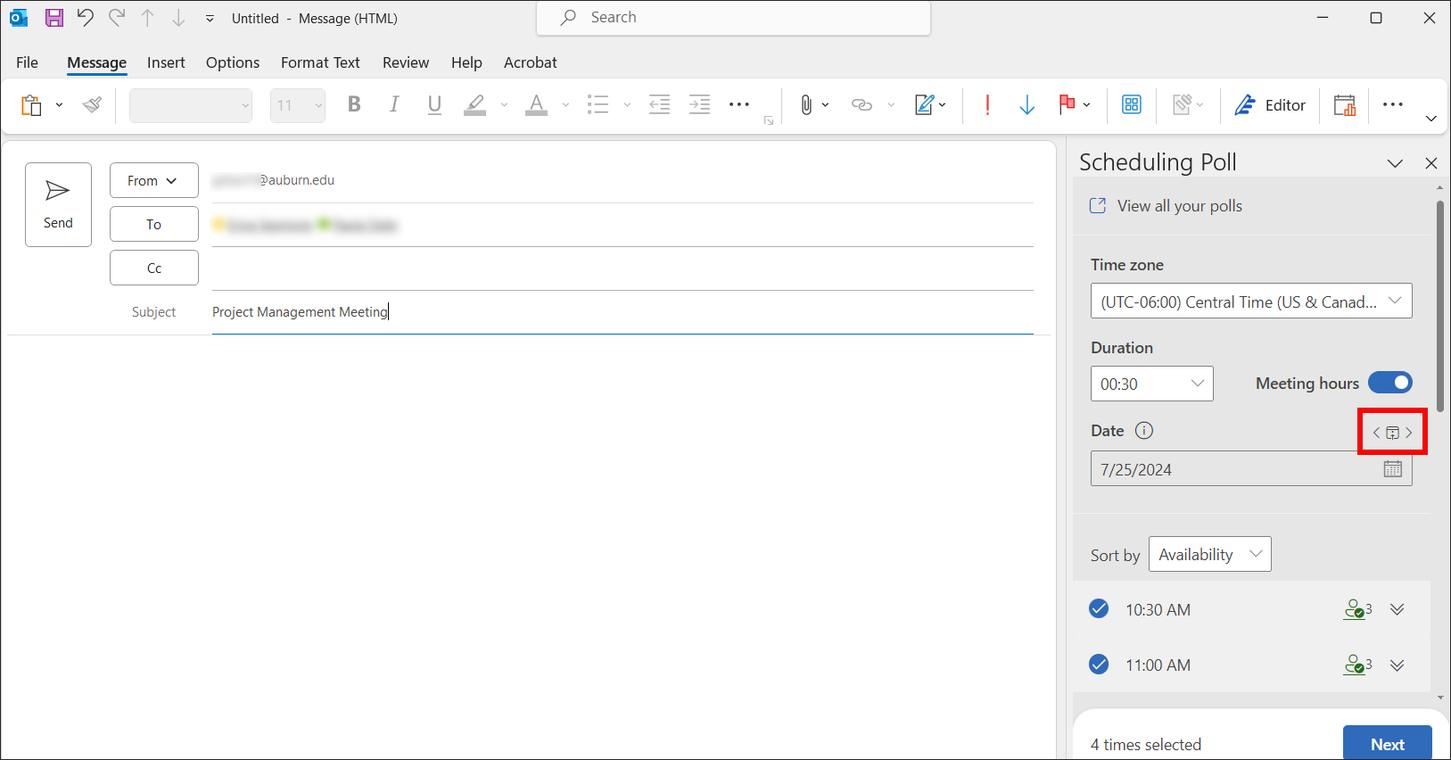 b. Click New Email to create a new message or click reply or forward from an existing message. List required recipients in the To field and optional recipients in the Cc field. On the Message tab, select New Scheduling Poll.