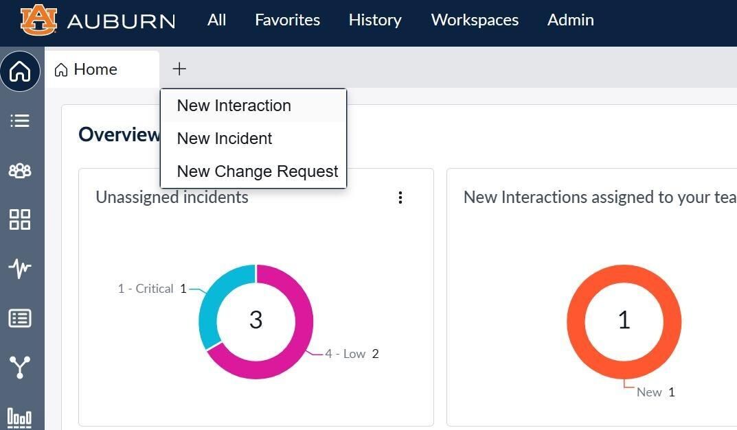 Click the plus sign (+) beside the home tab to create a new interaction, incident, or Change Request.