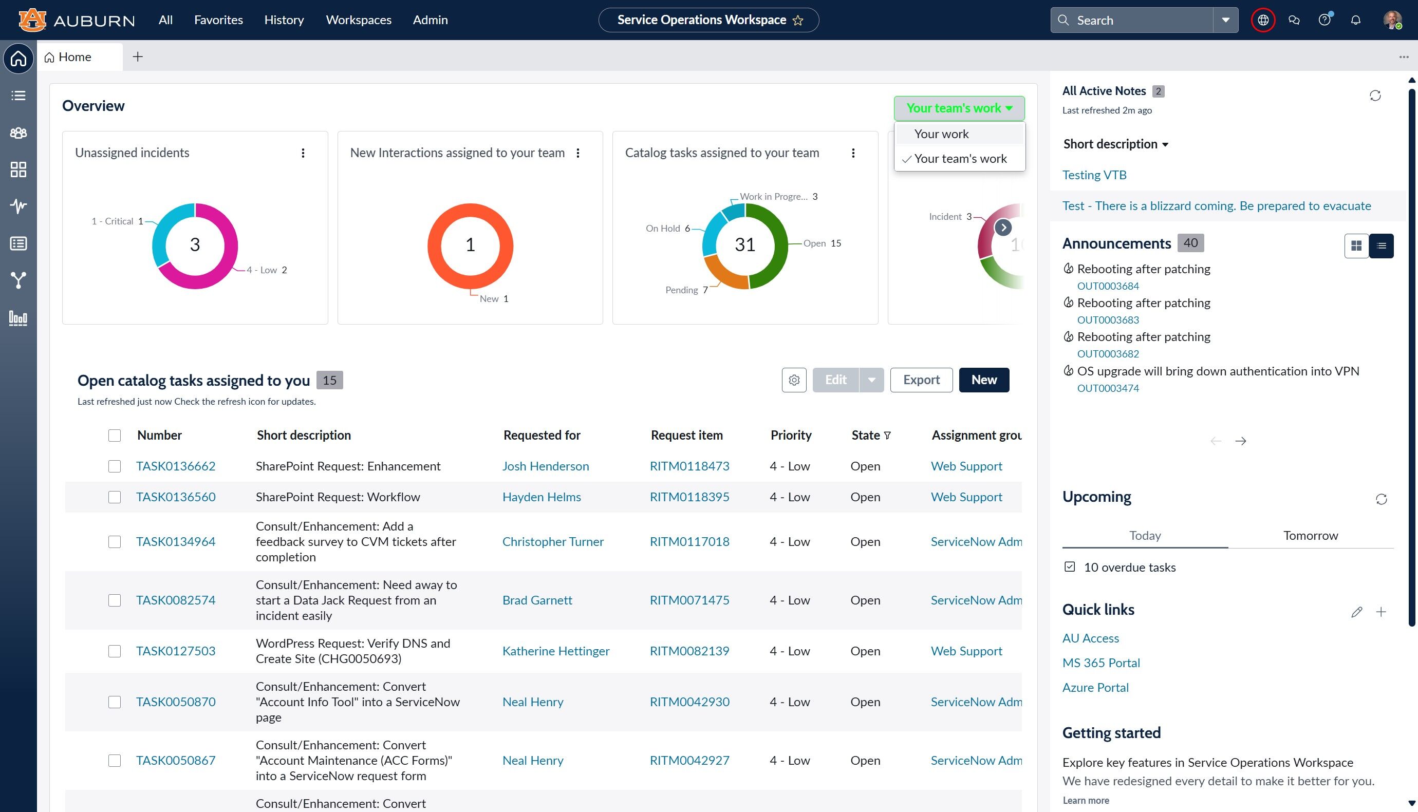 3. You can toggle between Your team's work and Your work by using the drop down to the right of the Overview section