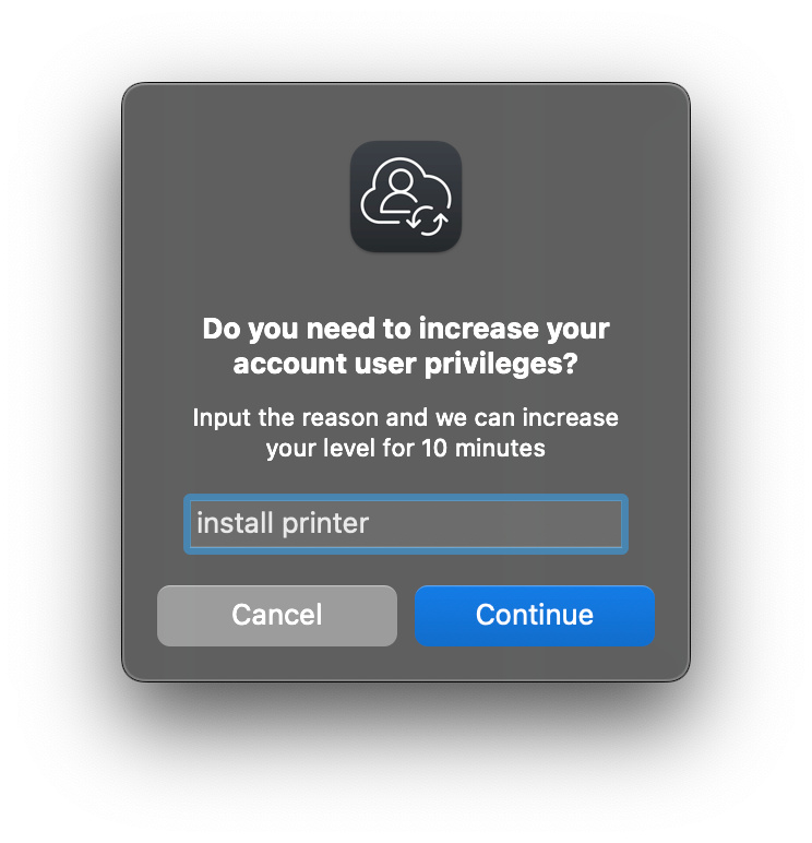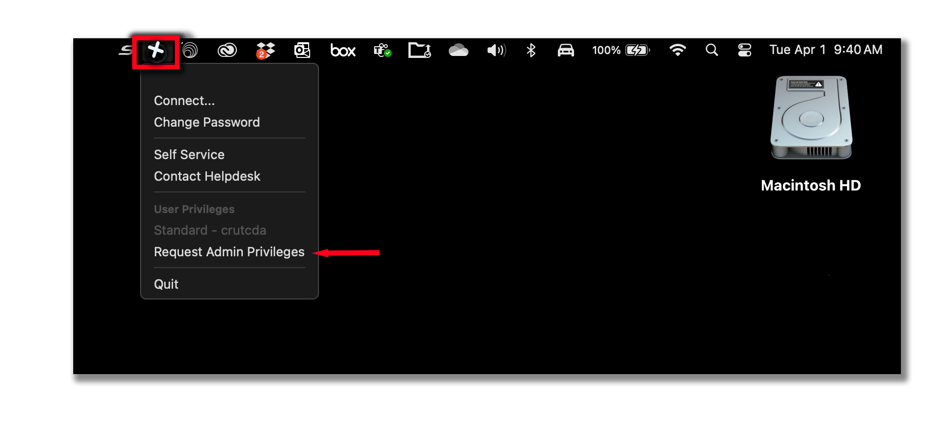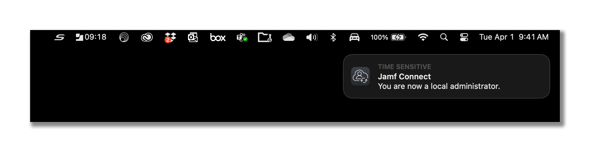 Locate the JAMF Connect icon in the menu bar. Right click and choose Request Admin Privileges