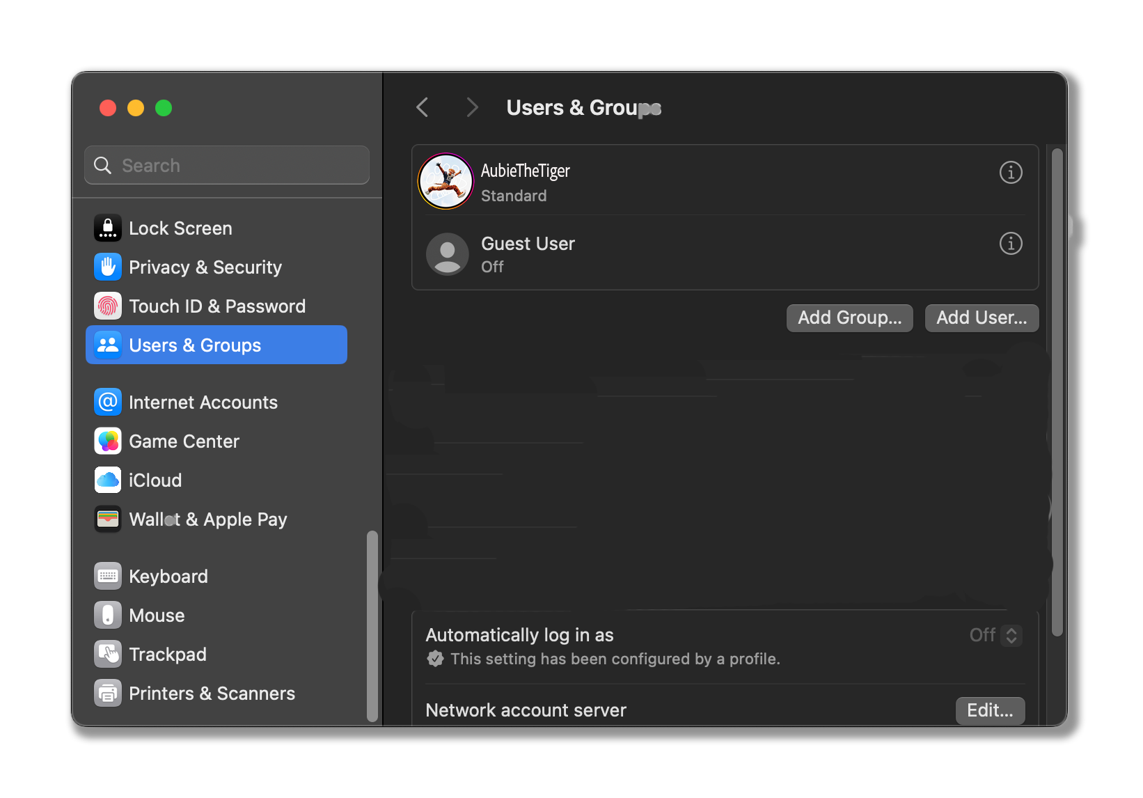 Open System Settings > Users and Groups to confirm access level. In this example AubieTheTiger is a standard users and their ability to make changes to the Operating System is limited.