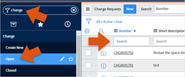 1. Navigate to your change already in progress. You can do this by searching for the CHG####### number in the top-right global search. Alternatively, you could search for Change in the filter navigator, view all Open changes and find your change there.