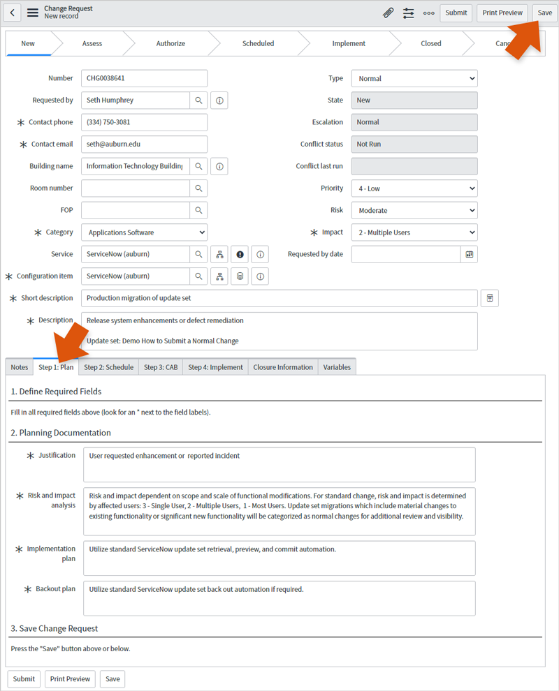 - Specifically, complete the Category & Configuration item selection, Description fields, Impact and Planning Documentation fields.
