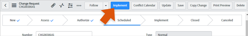 Entering the implementation phase automatically fills in the Actual start field and creates a Change Task (CTASK#######) to complete this Change Request.