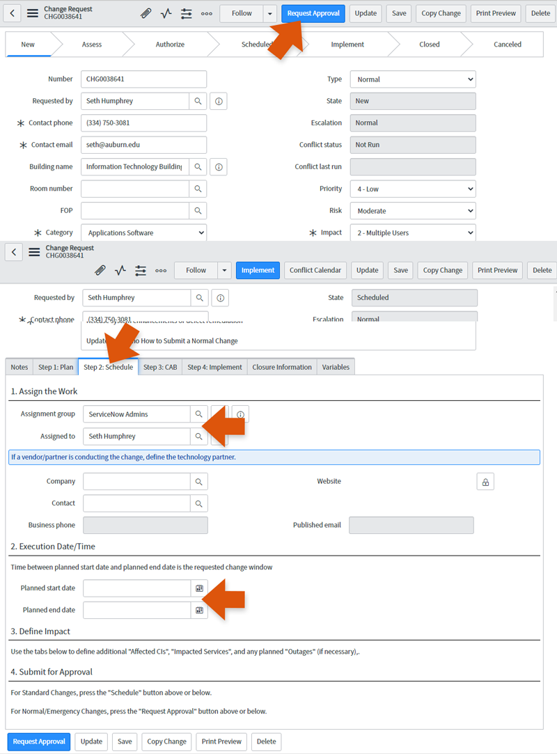 - To move the change to the next phase, select the Step 2: Schedule tab.