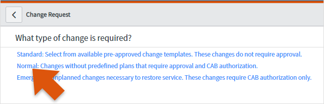 - On the "What type of change is required?" screen, click Normal: Changes without predefined plans that require approval and CAB authorization.